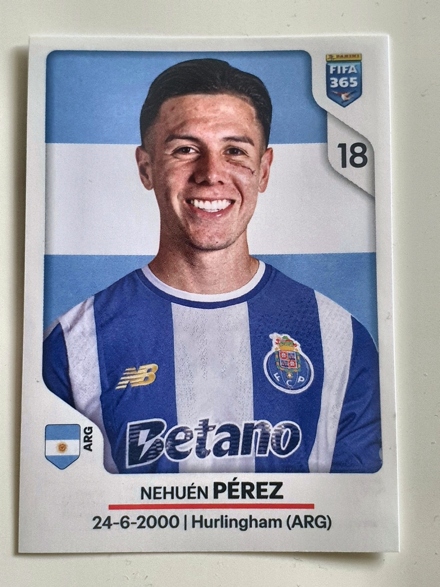 Sběratelská samolepka FIFA 365, samotná samolepkaČíslo: 18Jméno: Nehuén PérezDatum narození: 24. 6. 2000Místo: Hurlingham, Argentina
