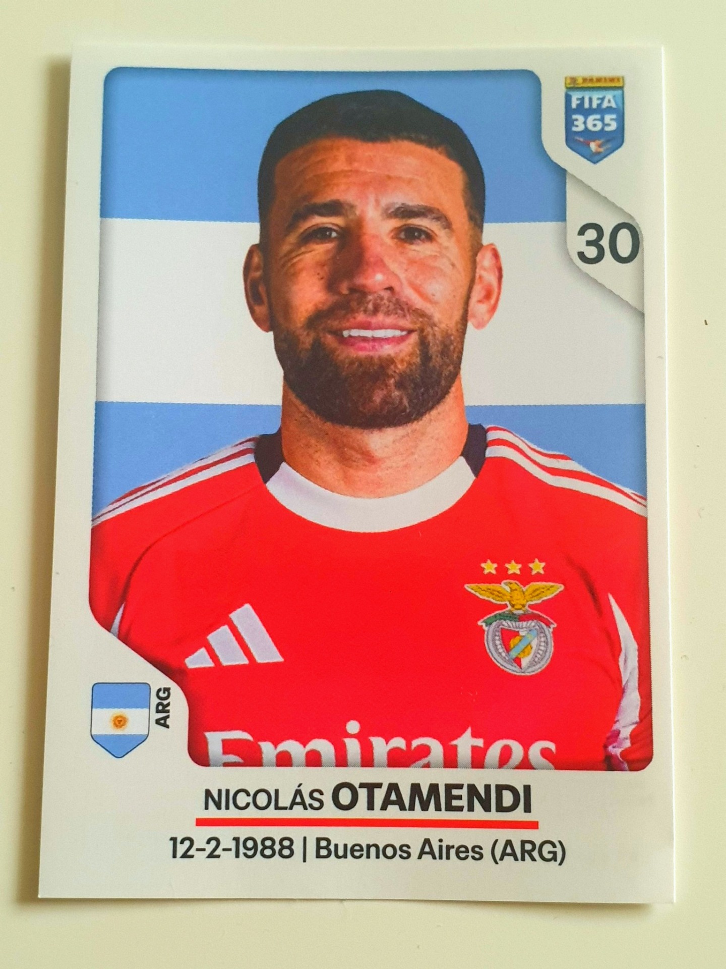 Sběratelská samolepka FIFA 365, samotná samolepkaČíslo: 30Jméno: Nicolás OtamendiDatum narození: 12. 2. 1988Místo: Buenos Aires, Argentina